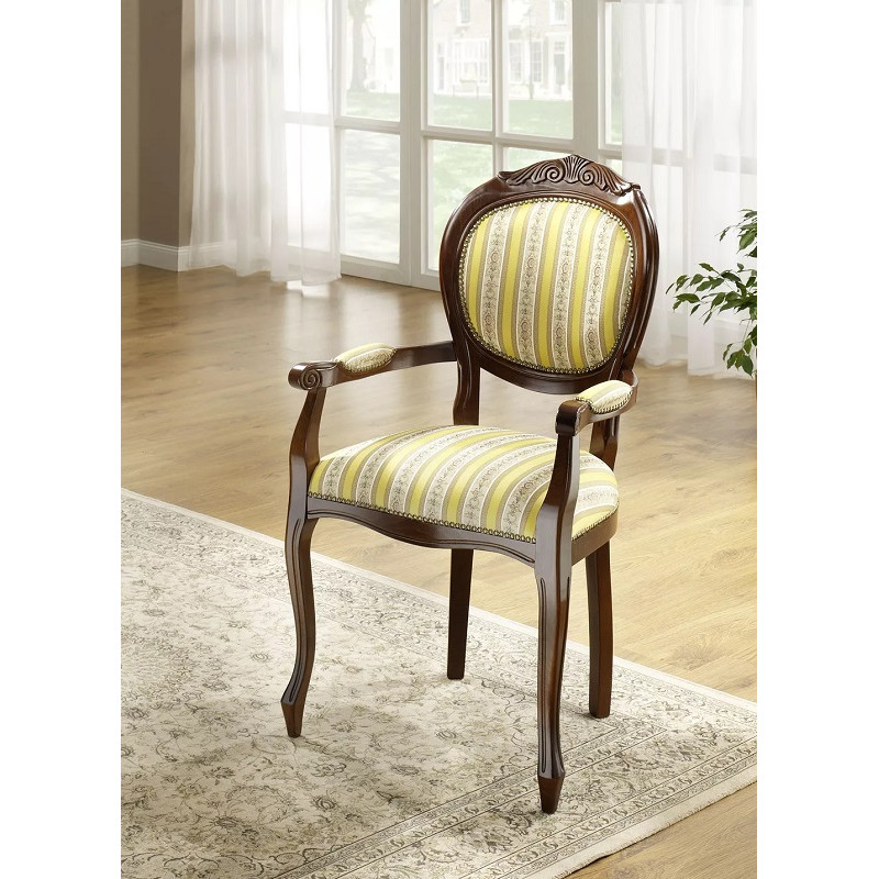 Németországból importált, Olaszországban készült, méretek: W58xD54xH102cm, ülésmagasság 52cm, ülésmélység 41cm, háttámla magassága 52cm, ülésszélesség 46cm, kárpitanyag puha tartós szövet 100% poliészter gyönyörű mintákkal, bükkfa diófa díszítéssel, fújtató acél rugómag Federkern Komfort + ülés tömör lélegző PUR, szép replika minőségi anyagokból készült, könnyű karbantartás, gyártó Domus Mobili Olaszország.