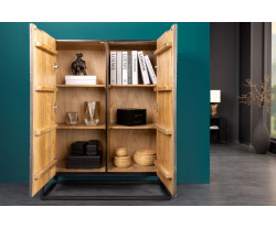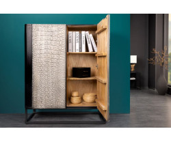 A Krokodil komód tömör mangófából készült, amely tartósságáról és egyedi megjelenéséről ismert. A komód hátulja MDF-ből készült, és furnérral van bevonva, ami hozzájárul a stabilitásához és tartósságához. A komód váza porszórt vasból készült, ami nemcsak modern megjelenést garantál, hanem nagyfokú sérülésállóságot is.