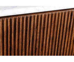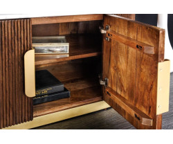 A stílusos GATSBY TV-állvány lakkozott mangófát, fehér márványlapot és fémkeretet ötvöz, elegáns és modern megjelenést kölcsönözve neki. 170 x 45 x 45 cm-es méreteivel és 4 zárt polcával ideális TV, elektronikai cikkek és dekorációk elhelyezésére. A kiváló minőségű anyagoknak és a robusztus konstrukciónak köszönhetően nemcsak praktikus, hanem luxus kiegészítője is lehet otthonának.