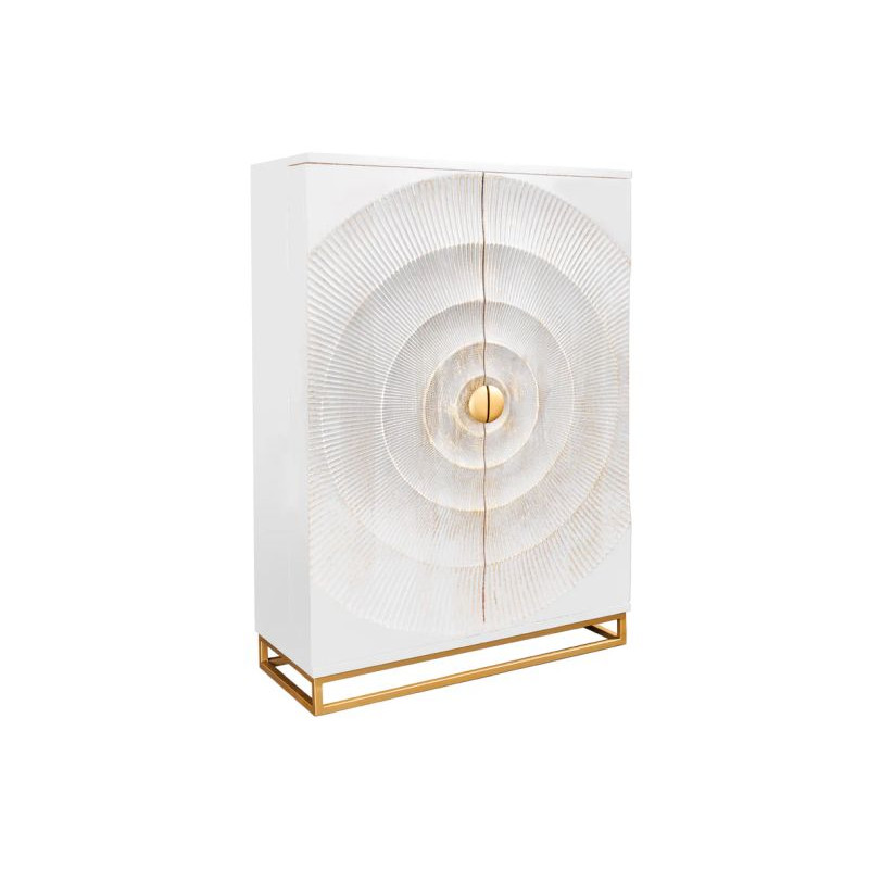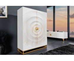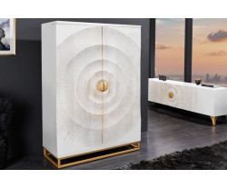 Fedezd fel a modern élet varázsát a GOLDEN SUNSET bárszekrénnyel. Ez a stílusos, 140 cm magas szekrény ideális kiegészítője minden olyan háztartásnak, amely elegáns és praktikus tárolási megoldásra vágyik. A szekrény kiváló minőségű mangófából készült, és modern fehér dizájnjával tűnik ki. Ezt a minimalista szépséget arany részletek egészítik ki, amelyek luxust és kifinomultságot kölcsönöznek a bútornak.