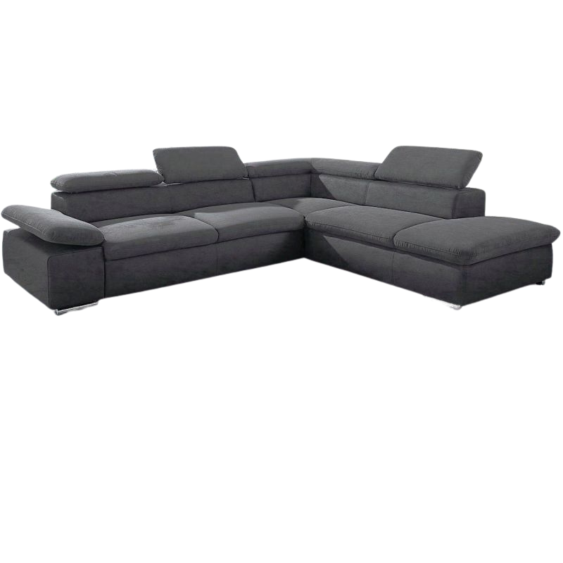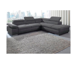 Elegancka narożna sofa VALANTINE wykonana z ciemnoszarej mikrofibry oferuje funkcję rozkładania, regulowane zagłówki i wygodę dzięki sprężynowemu rdzeniowi - idealna do nowoczesnego salonu.