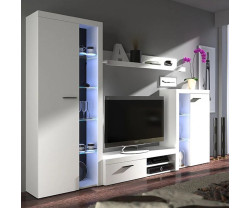 Ściana RUMBA do salonu składa się z dwóch witryn (mniejszej i większej), szafki RTV oraz półki wiszącej. Witryny wyposażone są w szklane półki, idealne do eksponowania szkła lub dekoracji. Za solidnymi drzwiami znajduje się kolejna półka wykonana z wysokiej jakości płyty wiórowej, idealna do przechowywania przedmiotów, które chcesz mieć w zasięgu ręki, ale niekoniecznie na widoku. Dla uzyskania maksymalnego efektu polecamy zakup oświetlenia LED, które przyjemnie oświetli Twoje ulubione przedmioty nawet w ciemne wieczory.