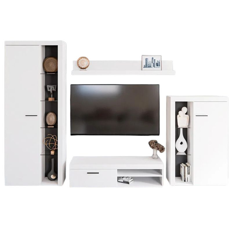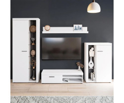 Korpus mebla ściennego w salonie wykonany jest z wysokiej jakości laminowanej płyty wiórowej o grubości 15 mm w popularnym odcieniu bieli. Dodatkowe listwy MDF o grubości 16 i 18 mm nadają meblowi masywny i solidny wygląd, a płyty HDF na tylnej stronie mebla, z od wewnątrz zmywalną stroną, zapewniają dodatkową wytrzymałość i łatwość konserwacji. Drzwi mebla wyposażone są w srebrne uchwyty, które podkreślają nowoczesny wygląd mebla.