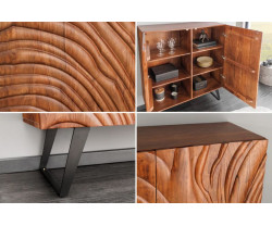 Komoda FLUID sa pýši robustnou konštrukciou a použitím kvalitných materiálov, ktoré zaisťujú dlhú životnosť. Hlavný materiál, agátové drevo, je známe svojou odolnosťou a krásnou textúrou. Lakovaný povrch zaisťuje ľahkú údržbu a ochranu proti poškodeniu. Rám komody je vyrobený z práškovo lakovaného kovu, ktorý dodáva produktu moderný vzhľad a stabilitu.