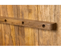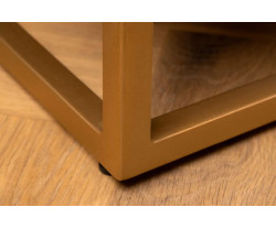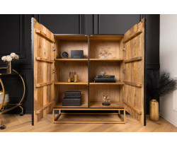 Korpus komody je vyrobený z kvalitného mangového dreva, ktoré je známe svojou odolnosťou a unikátnymi vzormi. Zadná doska z dyhy z dreva poskytuje dodatočnú pevnosť a stabilitu. Stojan komody, vyrobený z práškovo lakovaného železa v zlatej farbe, pridáva elegantný prvok, ktorý zvýrazní moderný štýl vášho domova.