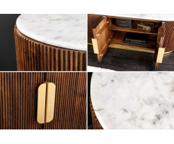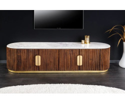 Štýlový TV stolík GATSBY kombinuje lakované mango drevo s bielou mramorovou doskou a kovovým rámom , čo vytvára elegantný a moderný vzhľad. S rozmermi 170 x 45 x 45 cm a 4 uzavretými poličkami je ideálny na umiestnenie TV, elektroniky a dekorácií. Vďaka kvalitným materiálom a robustnej konštrukcii je nielen praktický, ale aj luxusným doplnkom do vášho interiéru.